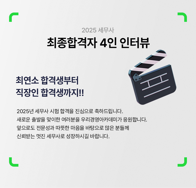 | 제목 | 정병창 선생님의 2025 세무사 최종합격자 인터뷰(최연소 합격생 부터 직장인 합격생까지!!) | ||||||