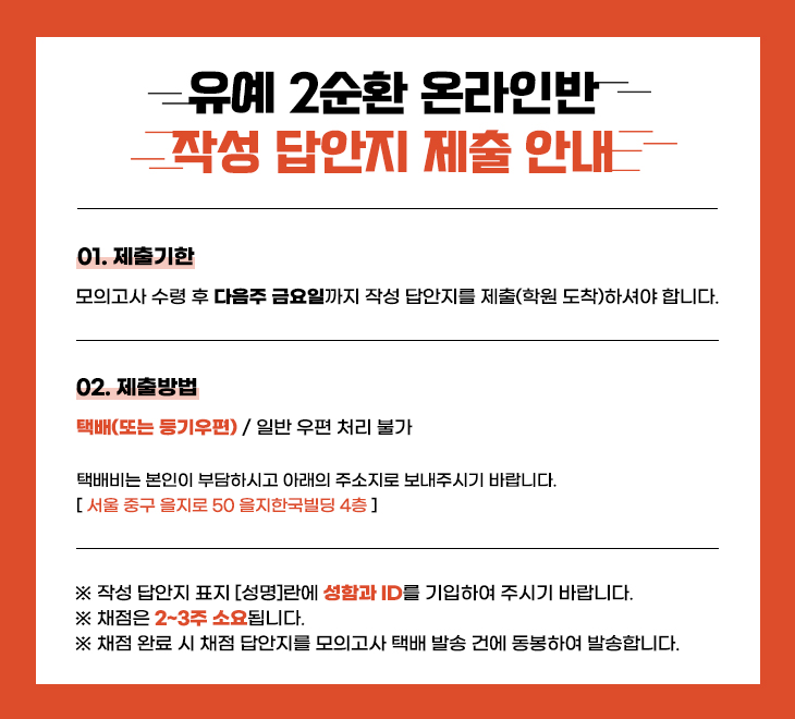 - 제출 기한 : 모의고사 수령 후 다음주 금요일까지 제출(학원 도착)