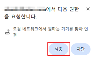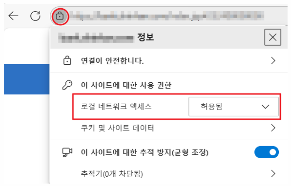 - 차단을 선택한 경우, 브라우저 화면 왼쪽 상단 아이콘을 클릭 후 "로컬 네트워크 액세스"를 허용됨으로 변경