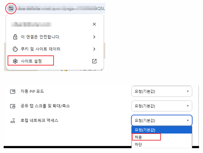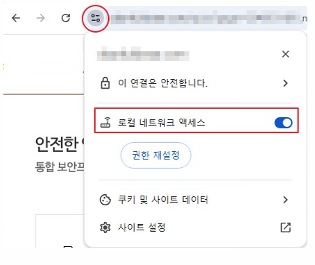 - 차단을 선택한 경우, 브라우저 화면 왼쪽 상단 아이콘으로 클릭 후 "로컬 네트워크 액세스"를 ON으로 변경