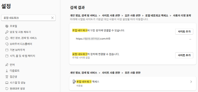 - 로컬 네트워크 연결을 허용/차단한 사이트 목록은 설정에서 "로컬 네트워크" 검색하거나 설정 > 개인정보,검색 및 서비스 > 사이트 사용 권한 > 모든 사용 권한 > 로컬 네트워크 엑세스에서 확인할 수 있으며 추가/삭제 가능합니다. |
